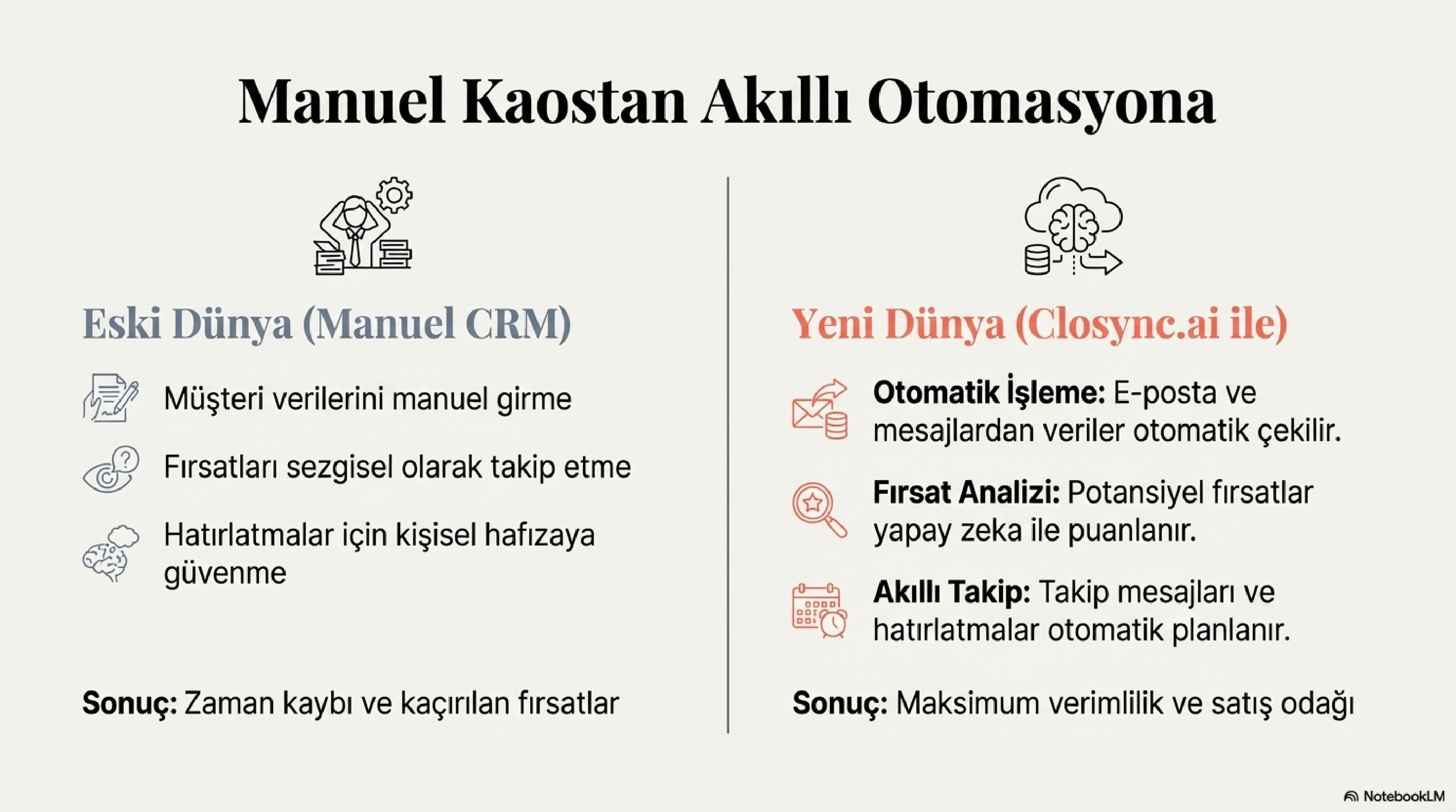 Bugün CRM artık yalnızca pasif bir kayıt aracı olmaktan çıkmıştır. Yapay zeka destekli CRM otomasyonu, satış süreçlerini manuel işlerden kurtaran bir devrimdir. Closync.ai gibi akıllı sistemler, satış temsilcilerinin vakit kaybetmeden müşteriyle etkileşime geçmesini sağlar.