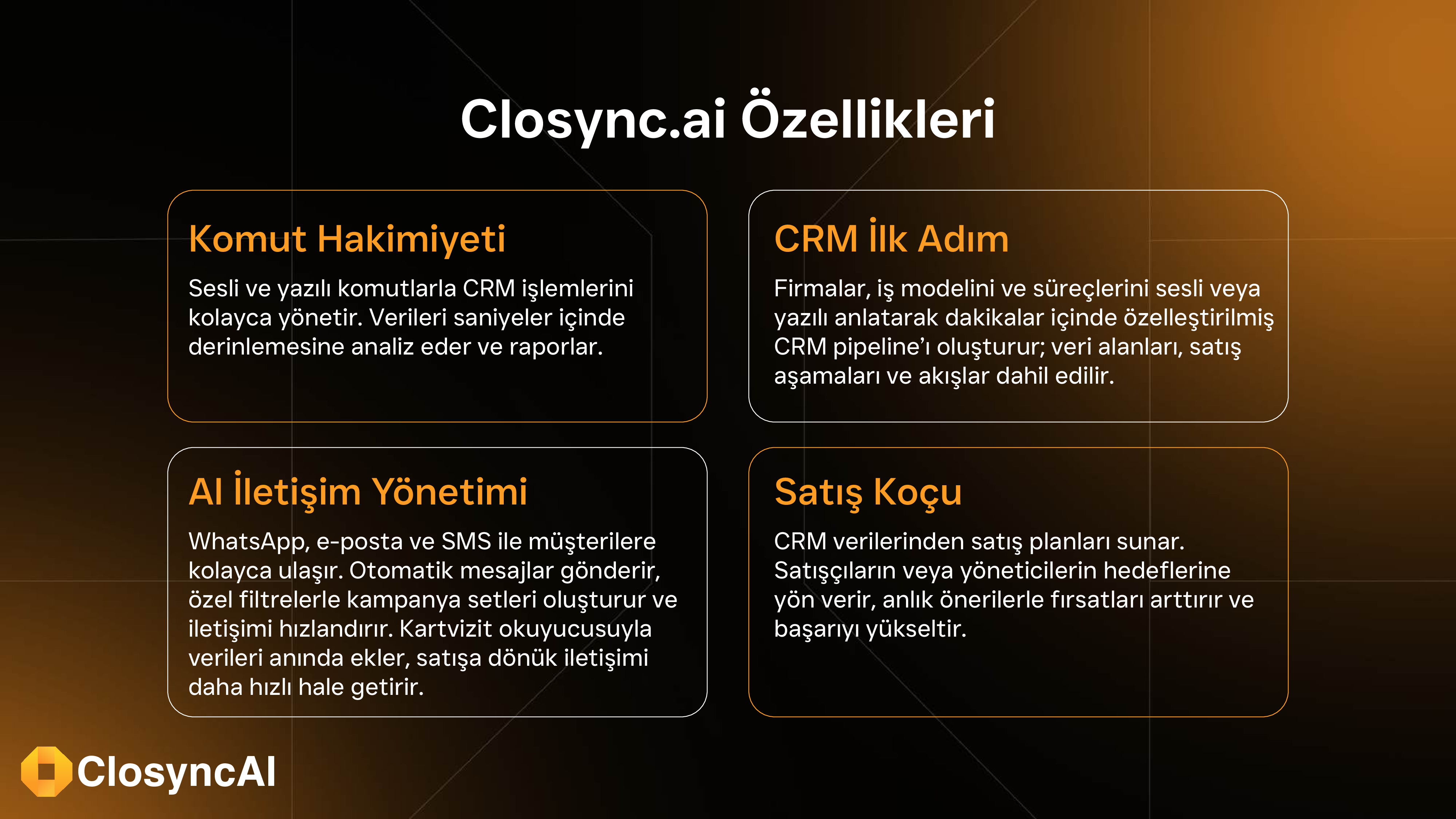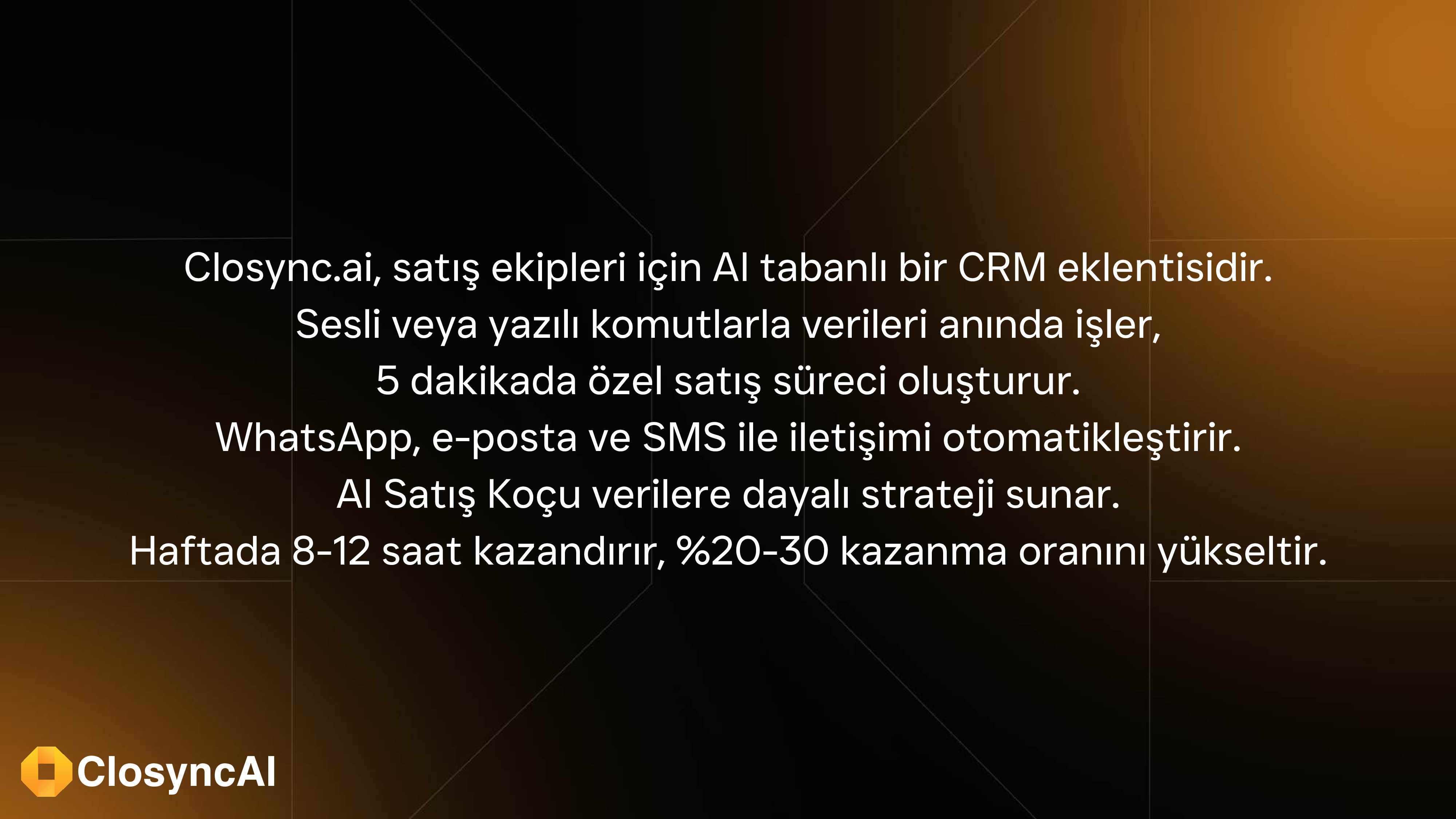 Closync.ai, WhatsApp, e-posta, SMS gibi tüm kanalları CRM’inizle entegre şekilde otomatikleştirmenizi sağlar.